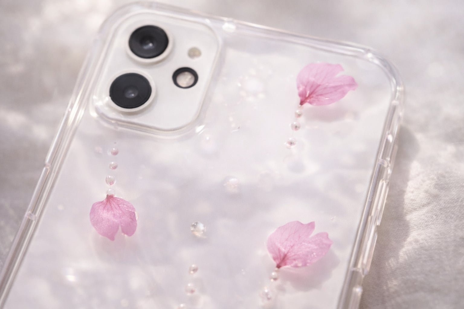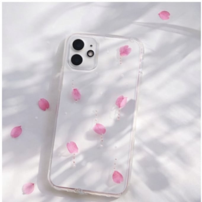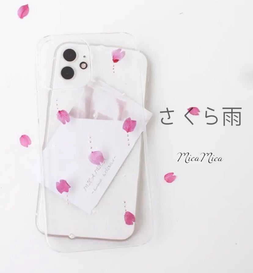 濃いピンクの花びらがクリアケースの中に広がり、まるで春の訪れをその手に感じられるような仕上がりになっています。