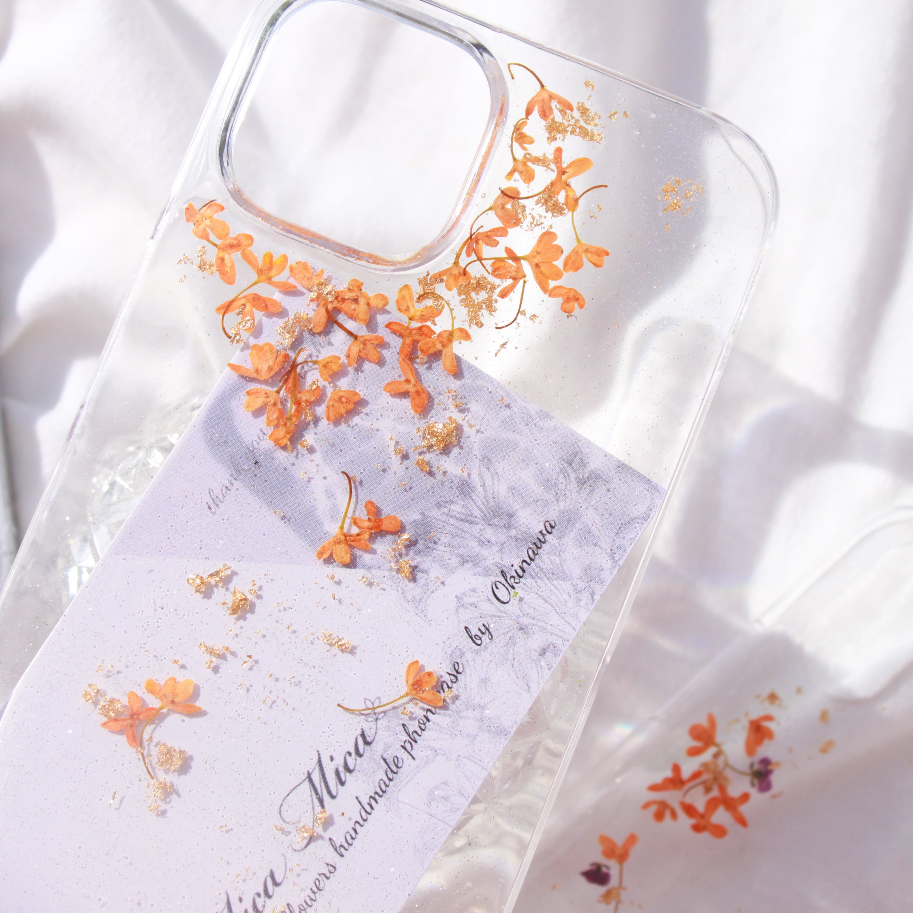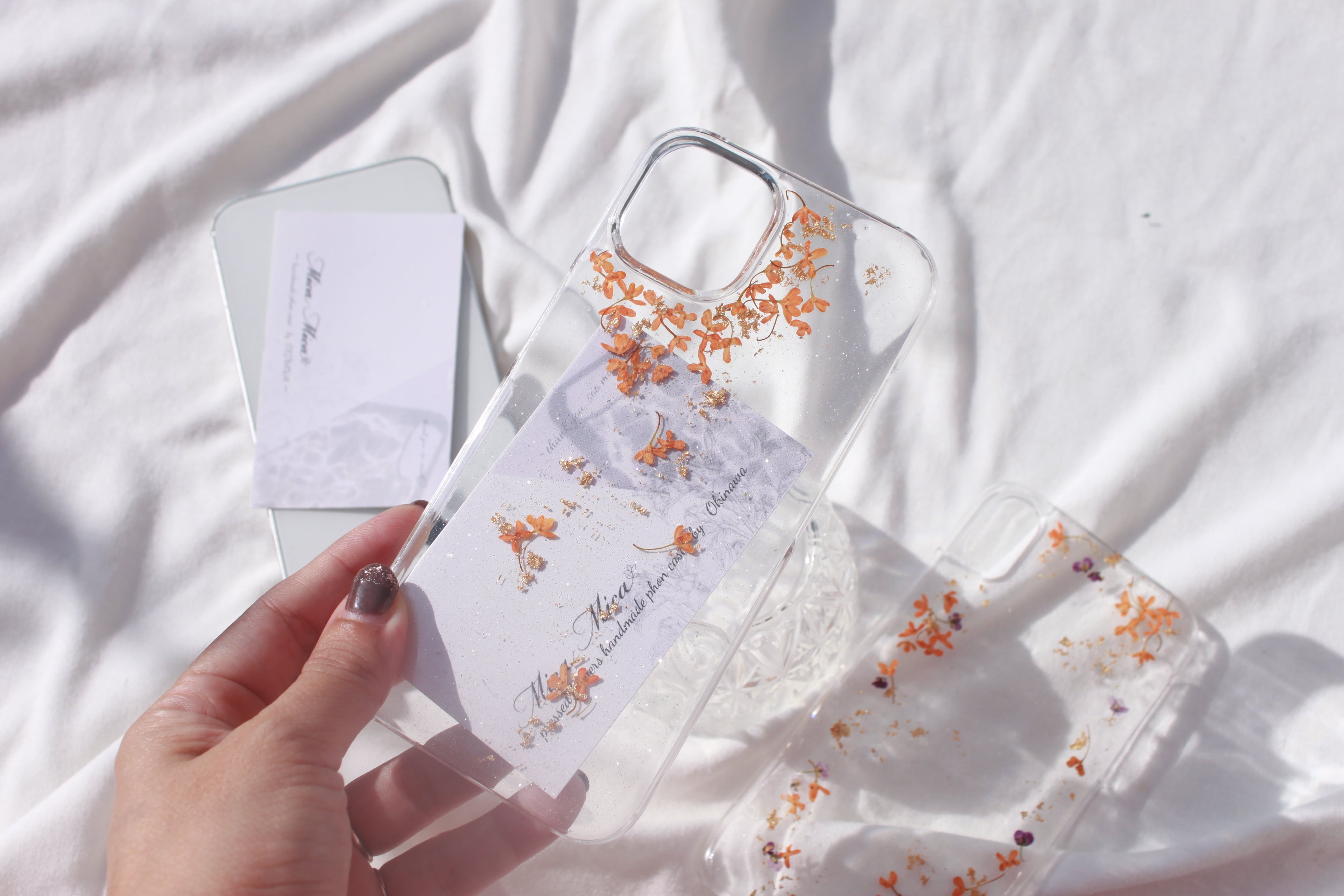本物の金木犀を使用したデザインは、細部にまでこだわり抜き、花の形や色合いが美しく、スマホを華やかに彩るようデザインしました。